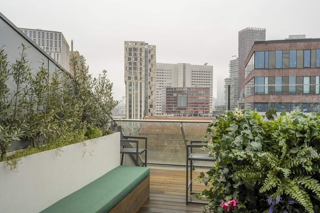 Iedere dag genieten van geweldig uitzicht over de bruisende stad Rotterdam, met iconische hoogstandjes zoals de Willemsbrug, Kubuswoningen en de glinsterende Maas aan je voeten. Dit unieke appartement uit 2014 kenmerkt zich door een plafondhoogte oplopend tot ca. 4m, een sfeervolle woonkamer met luxe open keuken en kookeiland, moderne badkamer, patio én groot dakterras op het zonnige zuiden. Tevens telt het appartement 2 riante slaapkamers met airco. Uiteraard is het appartement uitstekend geïsoleerd en voorzien van vloerverwarming én vloerkoeling.