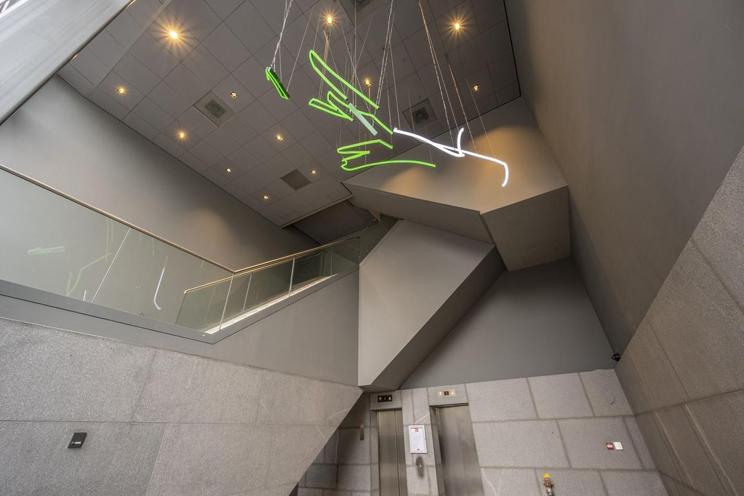 Spraakmakende entree op de tiende verdieping met een raam in het schuine vlak waardoor je een fantastisch uitzicht op de bedrijvigheid van de markthalvloer hebt. Dat is nog eens een binnenkomer in de ruime en lichte hal. Hier bevinden zich de meterkast, voldoende garderobe ruimte, een slim gepositioneerde berging en middels de hardhouten trap is de elfde (woon) verdieping toegankelijk. De aanwezige werkkast is desgewenst om te bouwen tot huislift.