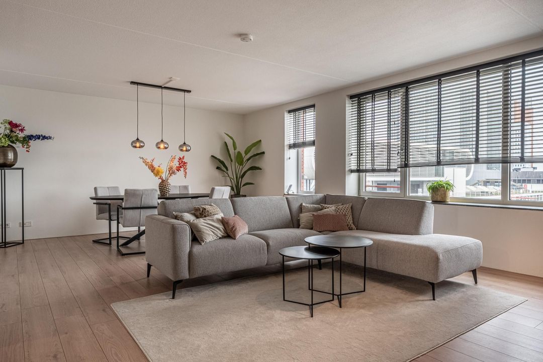 De woonkamer heeft grote raampartijen, waardoor je op meerdere plekken kunt genieten van het uitzicht over de Rijnhaven en de skyline. Dit zorgt voor veel lichtinval en een open gevoel.