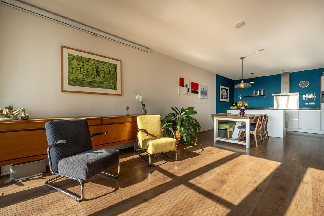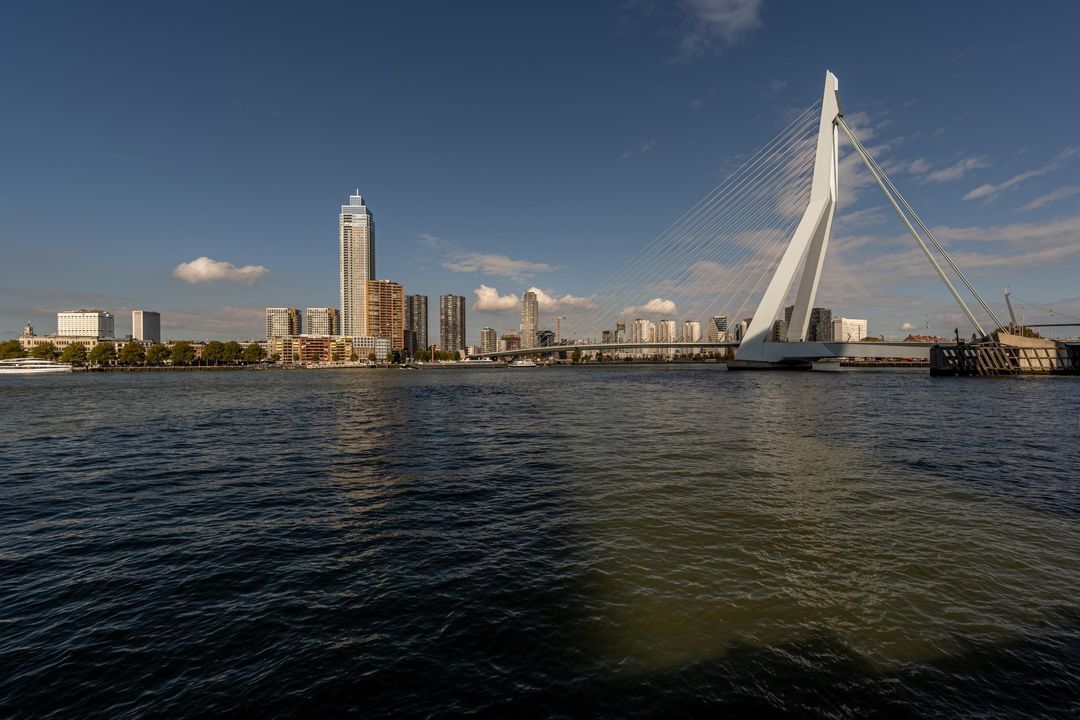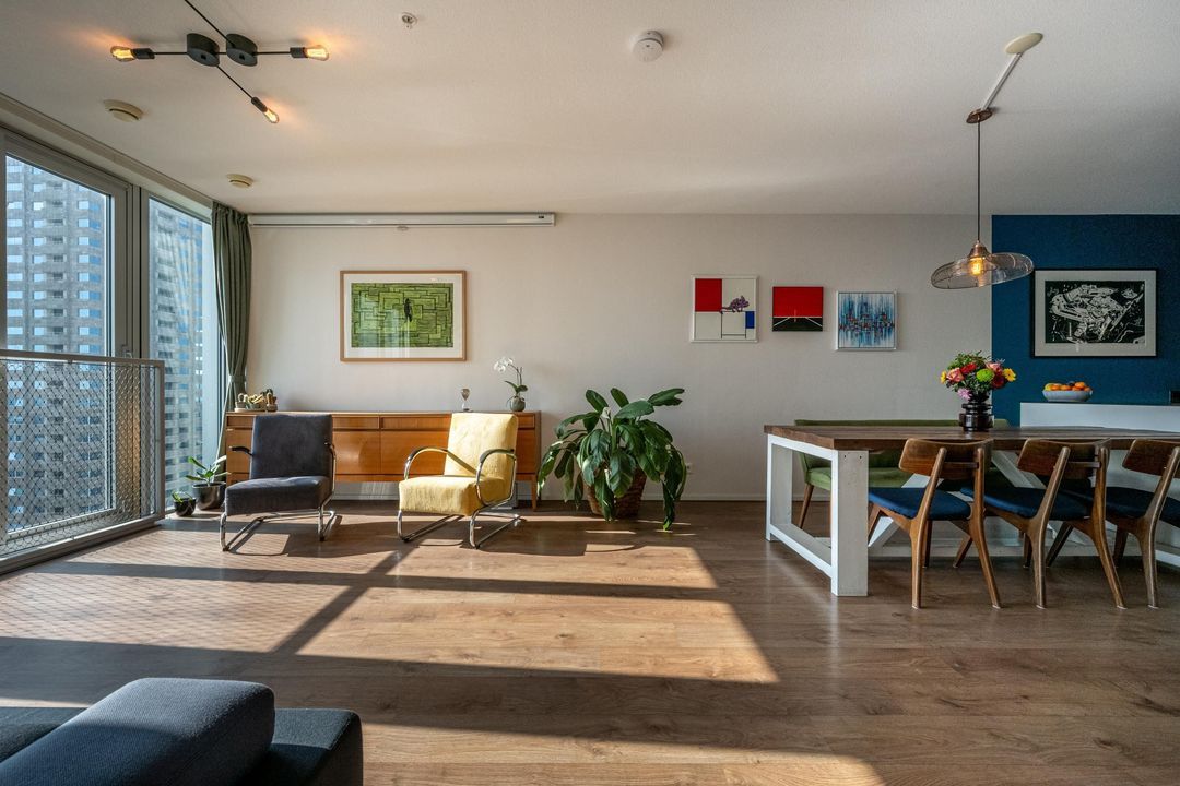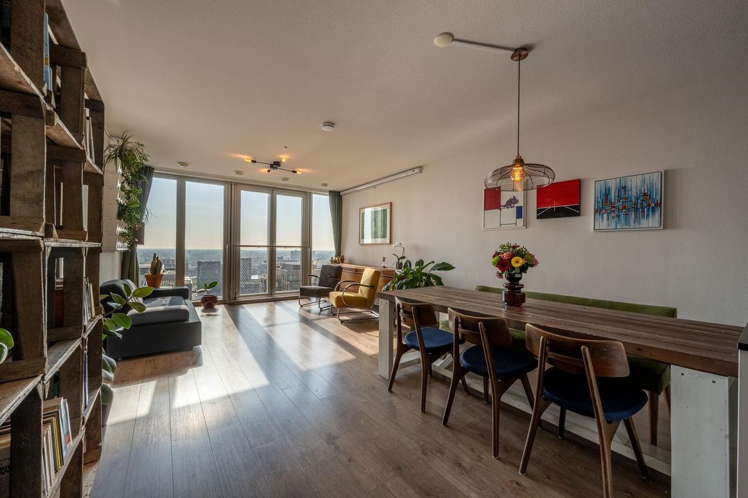 En wat meteen opvalt? Het fenomenale uitzicht! Gelegen op de 24e verdieping kijk je hier uit over het water en de indrukwekkende skyline van Rotterdam. Dankzij de ramen van vloer tot plafond en de schuifpui is er een zee van licht en een continu gevoel van ruimte. Er is plek genoeg voor een comfortabele zithoek én een gezellige eettafel.