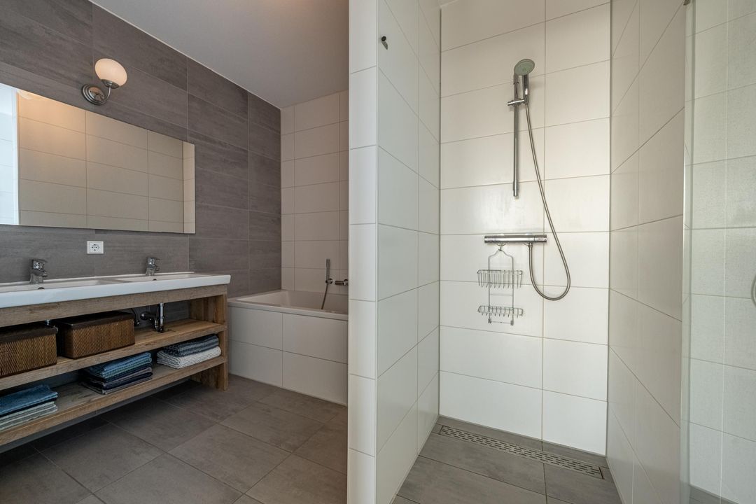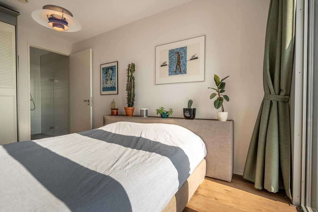 Grenzend aan de woonkamer vind je de masterbedroom, eveneens met een prachtig uitzicht over het water en de skyline. Hier is bovendien een ingebouwde kledingkast aanwezig. De en-suite badkamer maakt het geheel compleet: een luxe ruimte met inloopdouche, ligbad, dubbele wastafel en designradiator. De combinatie van witte en grijze wandtegels met de moderne vloertegels (met vloerverwarming) geeft de badkamer een stijlvolle uitstraling.