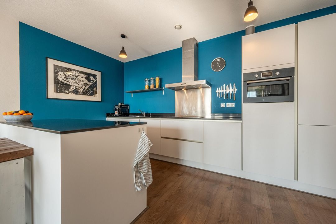De open keuken sluit naadloos aan op de woonkamer en is voorzien van alle gemakken: een inductiekookplaat met recirculatiekap, combi-oven, vaatwasser en koel-vriescombinatie. De strakke witte fronten en het composiet werkblad geven de keuken een moderne uitstraling, terwijl het extra werkblad op het eiland voor zowel kookplezier als gezelligheid zorgt.
