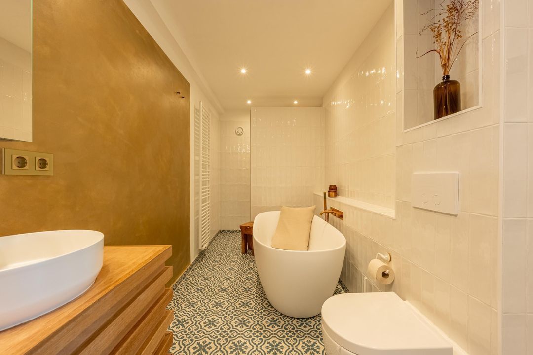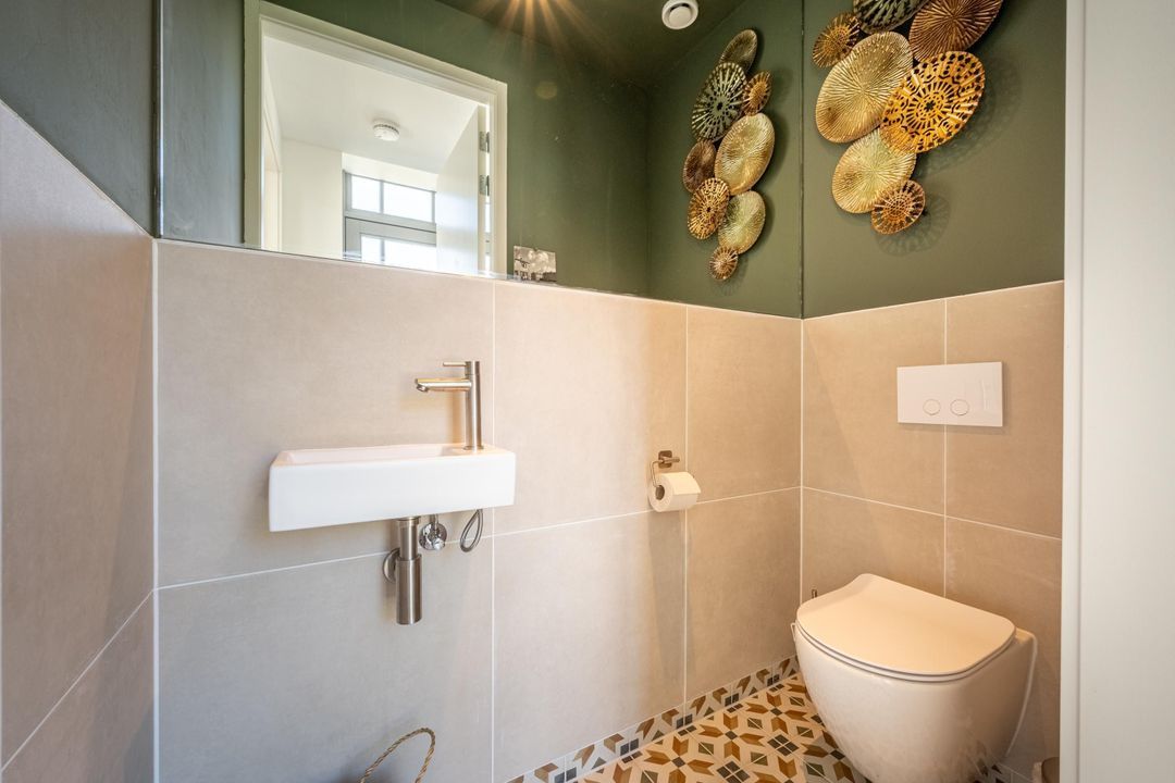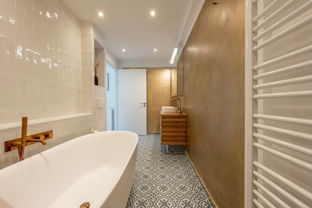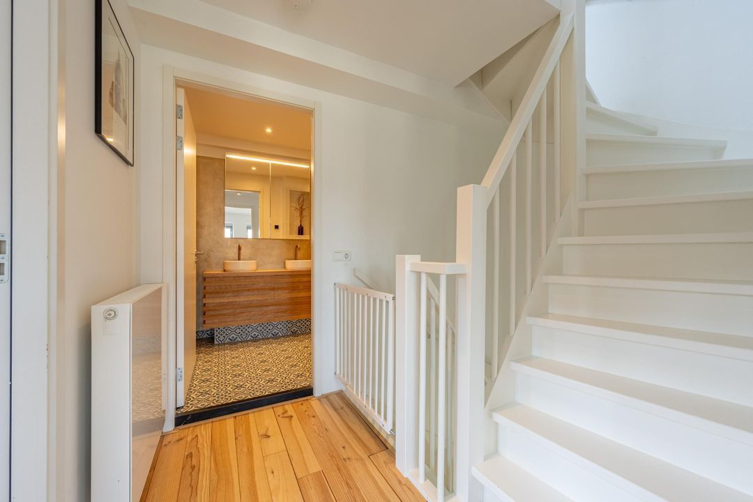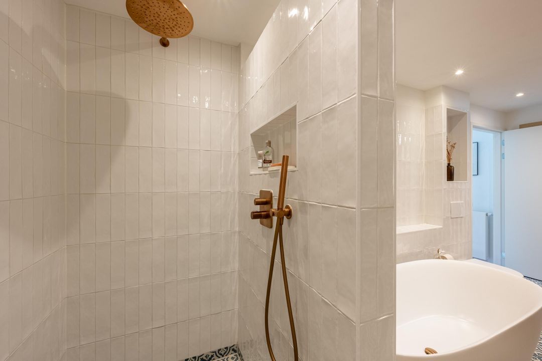 De sfeervolle badkamer is van alle gemakken voorzien: een heerlijk vrijstaand ligbad, ruime inloopdouche, wastafelmeubel met dubbele waskom en praktische spiegelkast, toilet en design radiator. De eyecatcher zijn de ingefreesde koperen kranen die in de hele badkamer terug komen. Daarnaast is er mechanische ventilatie en vloerverwarming voor extra comfort.