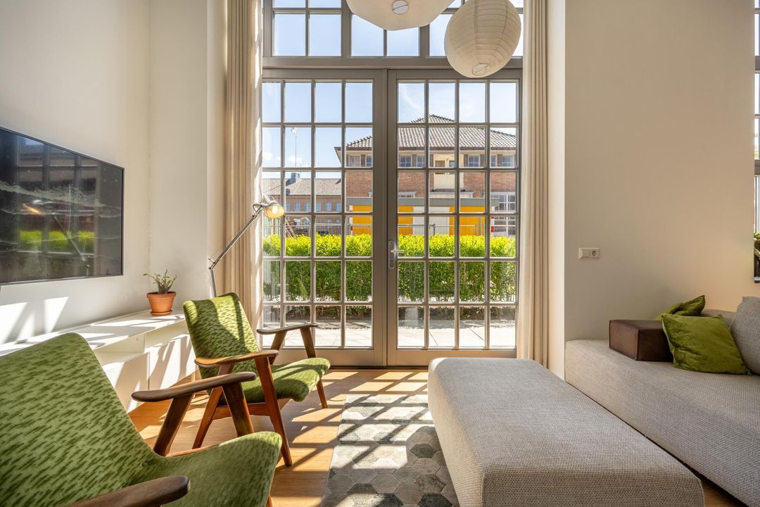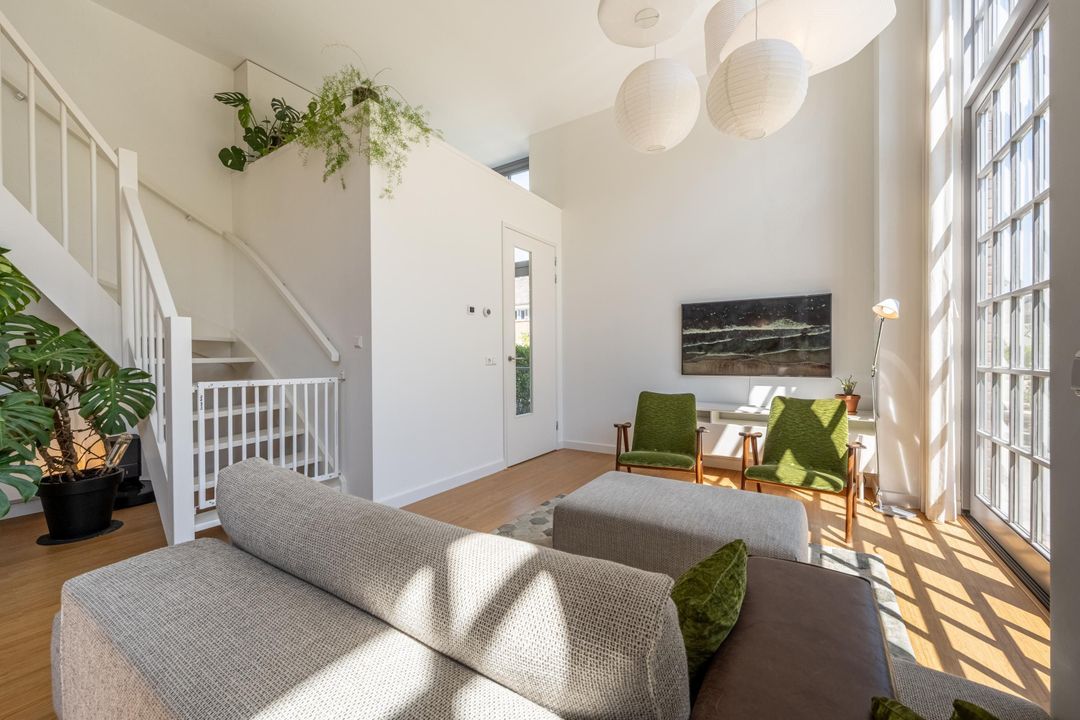 Entree met meterkast, riante toiletruimte en toegang tot de woonkamer. Bij binnenkomst in de woonkamer valt direct de imposante plafondhoogte van maar liefst 3,81 meter op – een zeldzaam gevoel van ruimte en grandeur dat je meteen omarmt. De royale kamer biedt volop mogelijkheden voor een sfeervolle zithoek bij de openslaande deuren naar de tuin. Daarnaast is er ruimte voor een grote eettafel waar het hele gezin aan kan aanschuiven.