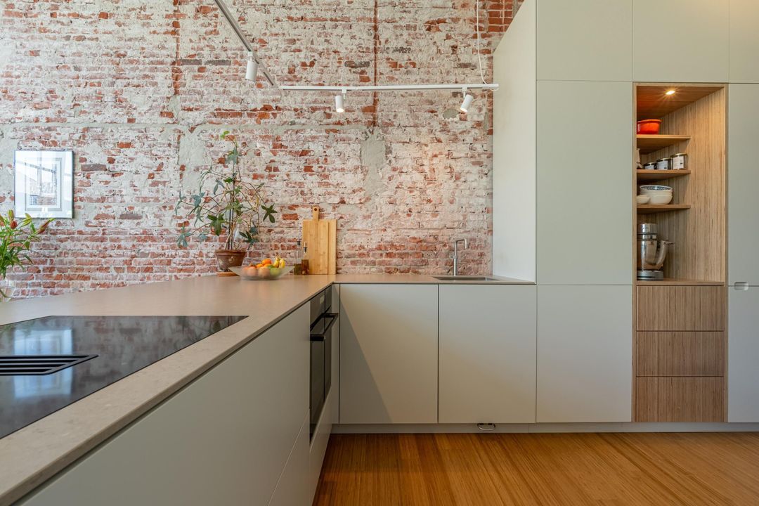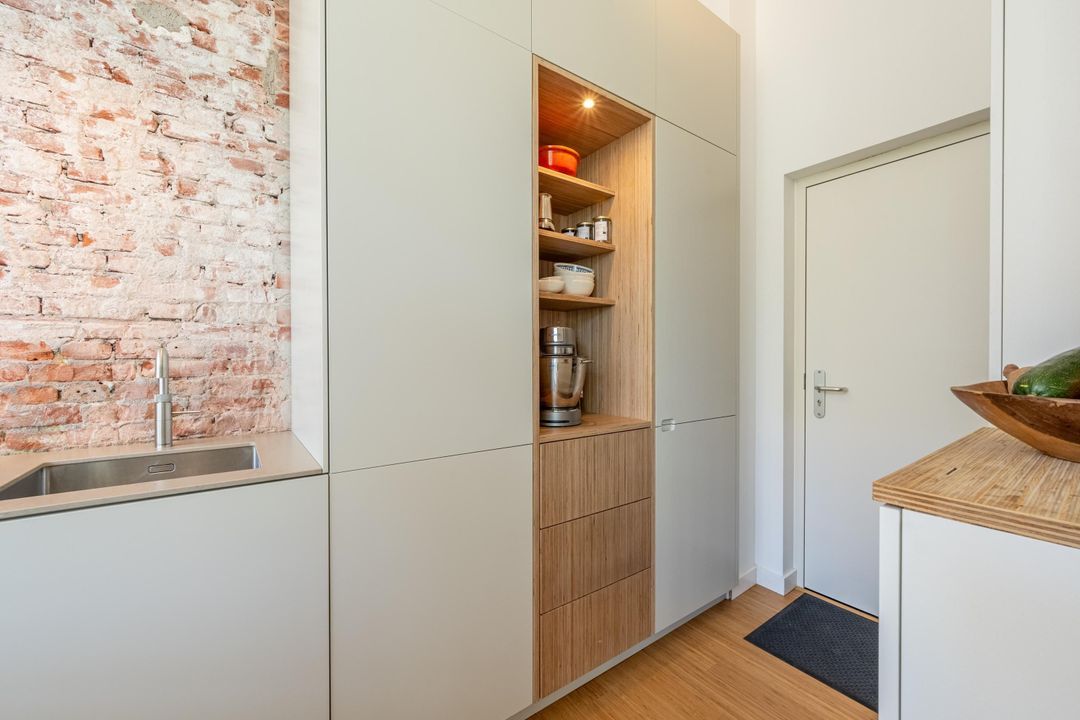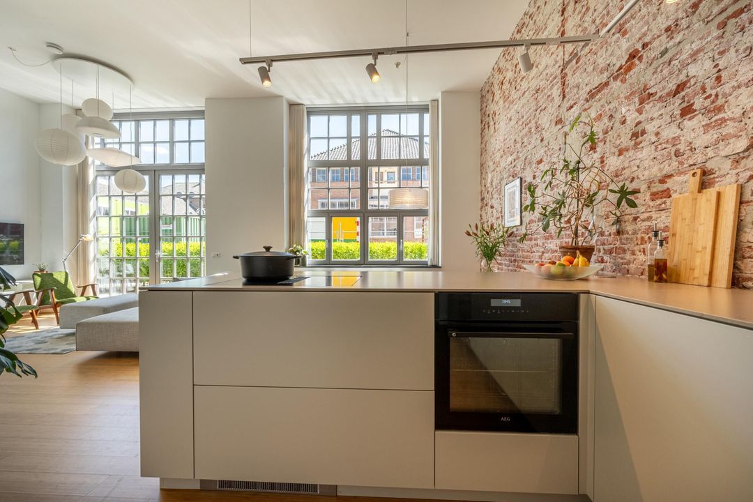 Gesitueerd tegen de originele buitenwand is de op maakt gemaakte open keuken een echte eyecatcher. Deze is ingedeeld in een L-vorm waardoor er een modern kookeiland is gecreëerd. Verder beschikt de keuken over alle gewenste hoogwaardige apparatuur: een inductiekookplaat met geïntrigeerde afzuigkap, oven, koel-vriescombinatie, vaatwasser, Quooker en veel opbergruimte. Vanuit de keuken is er inpandig toegang tot de gemeenschappelijke fietsenstalling en de eigen berging.
