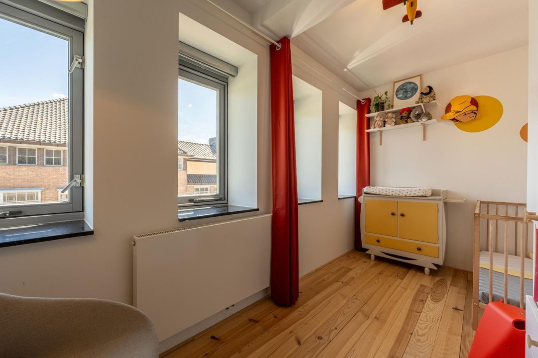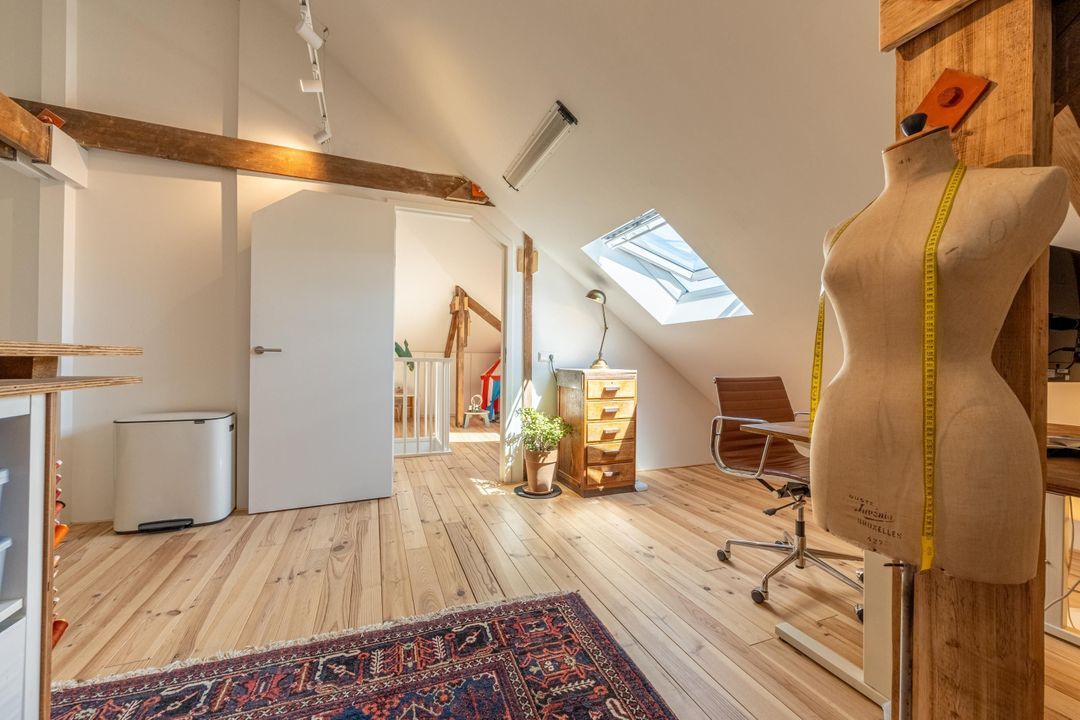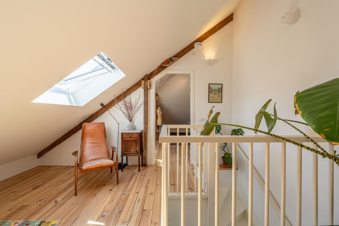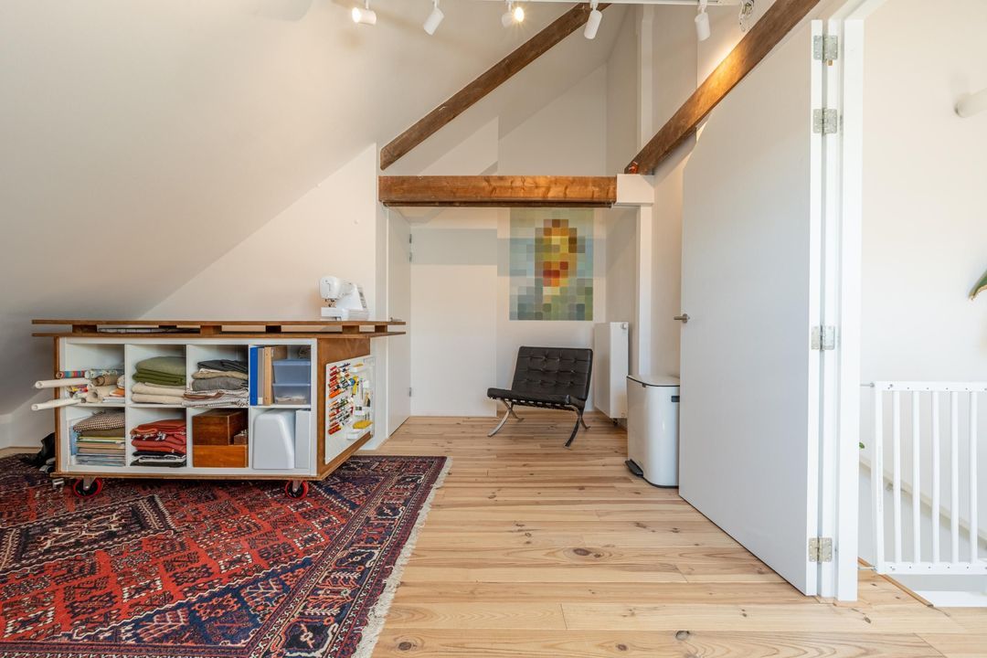 Ruime overloop met knieschotten, veel lichtinval en ruimte voor een speelzolder of een thuiswerkplek. Vanuit hier is er toegang tot de derde slaapkamer met fantastische hoge nok en originele balken. Deze kamer is van uitstekend formaat en eveneens voorzien veel natuurlijk daglicht. De kamer is uitermate geschikt als hobbyruimte of extra slaapkamer. Ook is er handige bergruimte aanwezig met de wasmachine- en drogeropstelling en de mechanische ventilatie box.