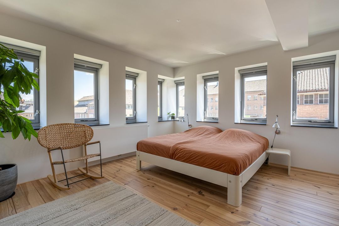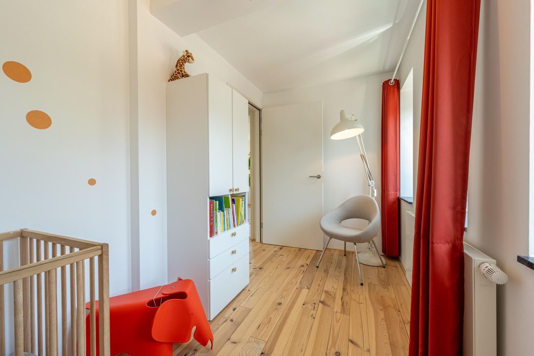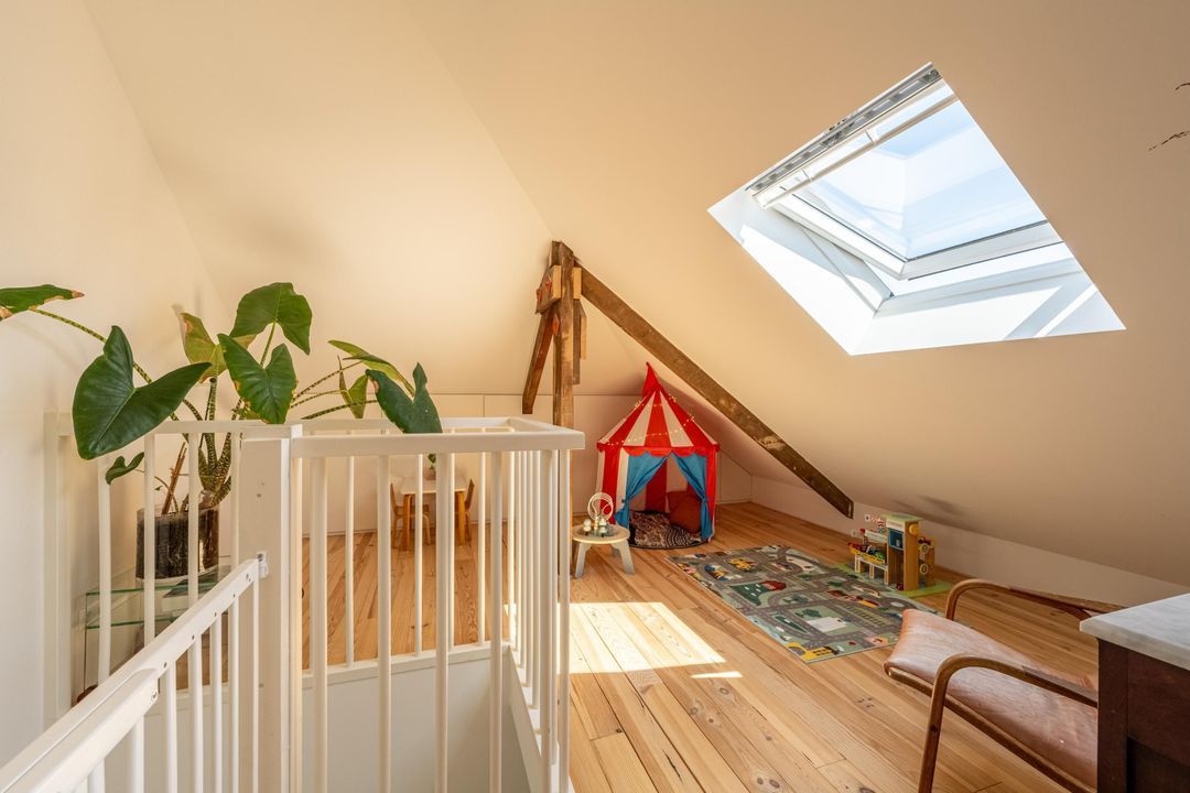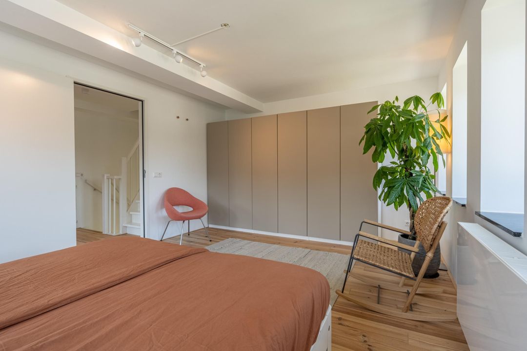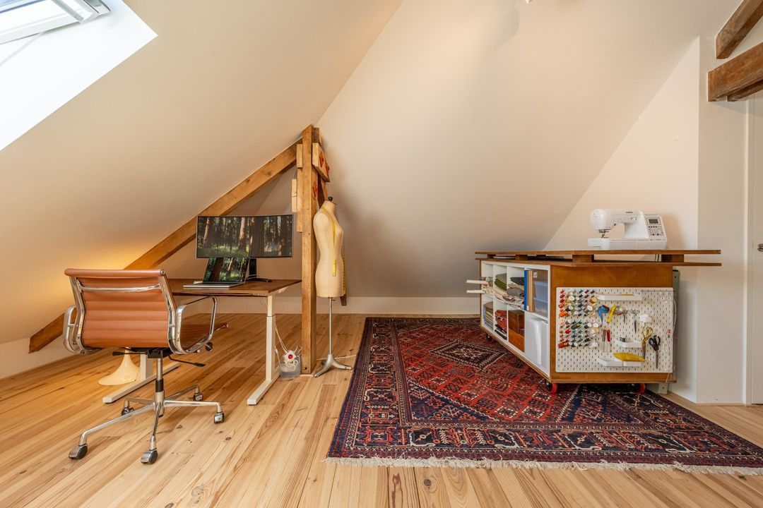 Ruime overloop met knieschotten, veel lichtinval en ruimte voor een speelzolder of een thuiswerkplek. Vanuit hier is er toegang tot de derde slaapkamer met fantastische hoge nok en originele balken. Deze kamer is van uitstekend formaat en eveneens voorzien veel natuurlijk daglicht. De kamer is uitermate geschikt als hobbyruimte of extra slaapkamer. Ook is er handige bergruimte aanwezig met de wasmachine- en drogeropstelling en de mechanische ventilatie box.