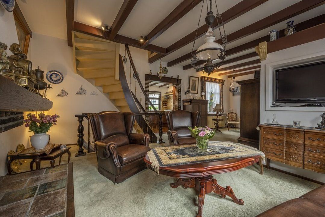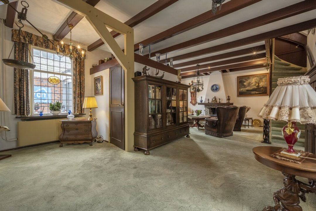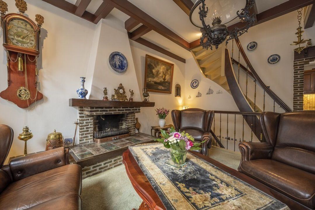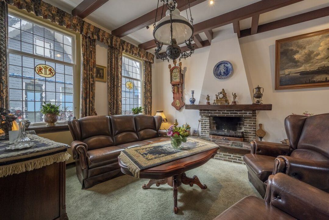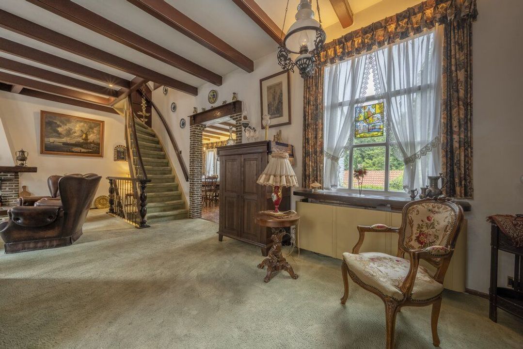 In de ruime woonkamer heerst een fijne woonsfeer onder andere door het originele balkenplafond en de open haard. Maar de glas-in-loodramen dragen daar zeker ook aan bij.