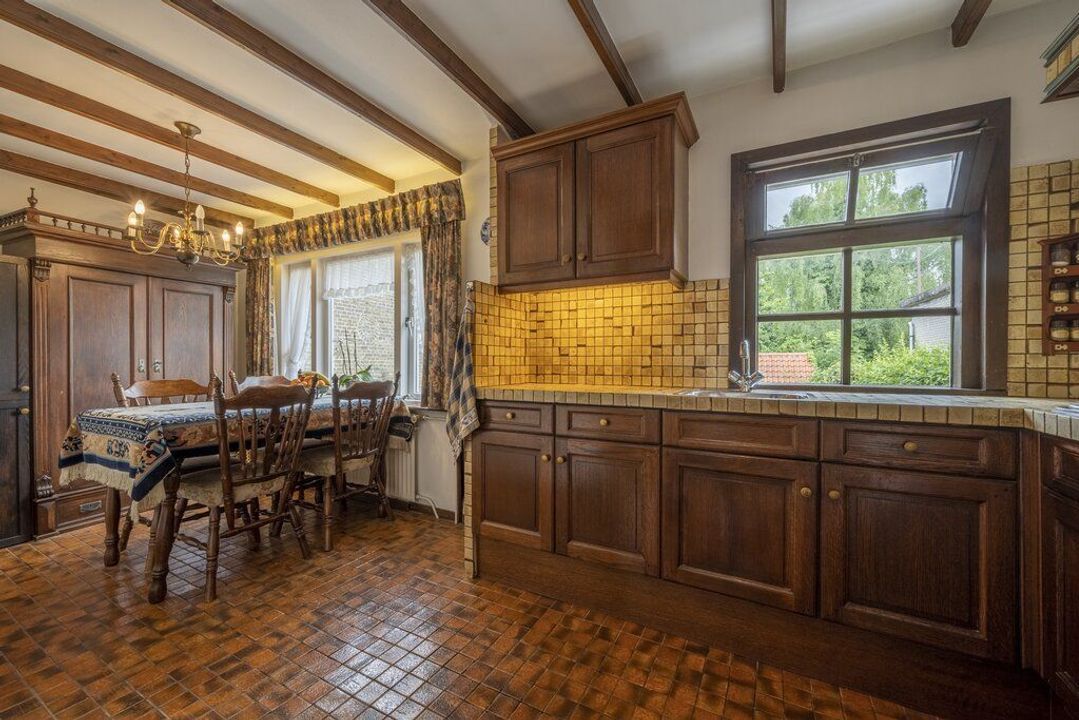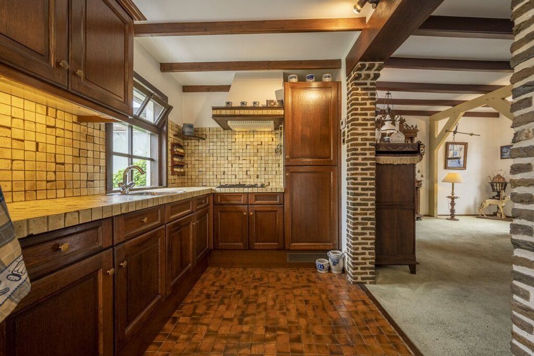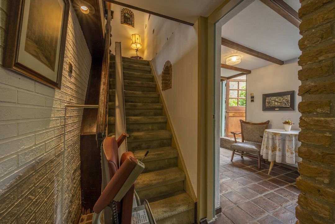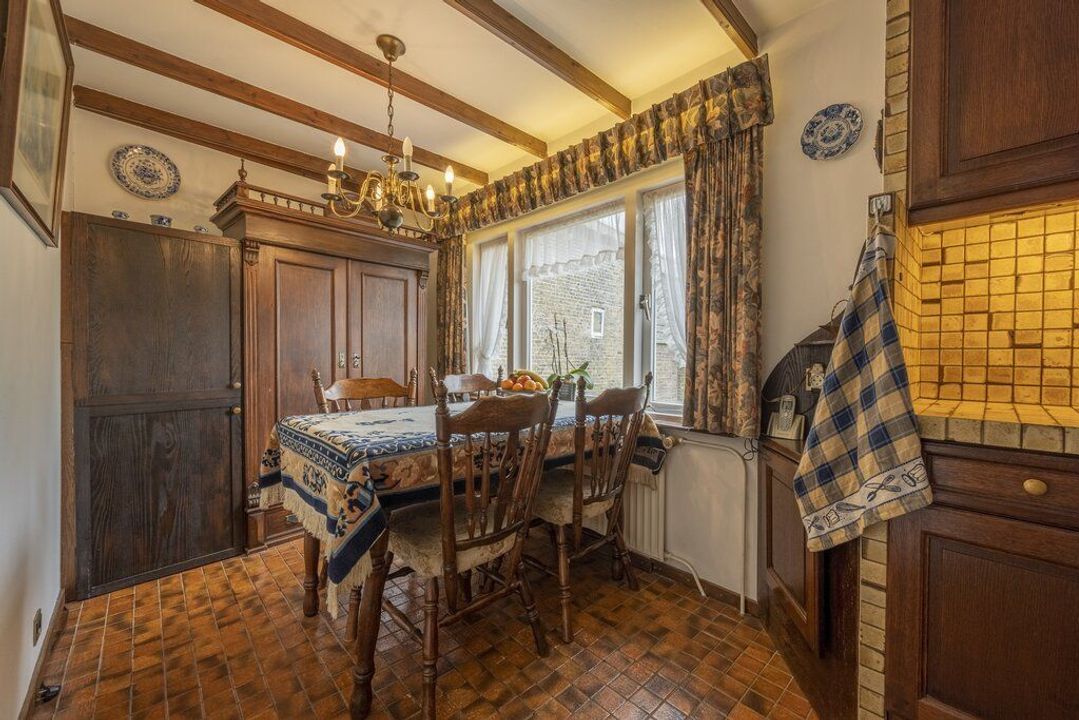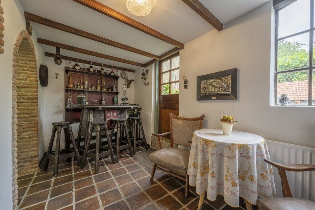 In de ruime woonkamer heerst een fijne woonsfeer onder andere door het originele balkenplafond en de open haard. Maar de glas-in-loodramen dragen daar zeker ook aan bij.