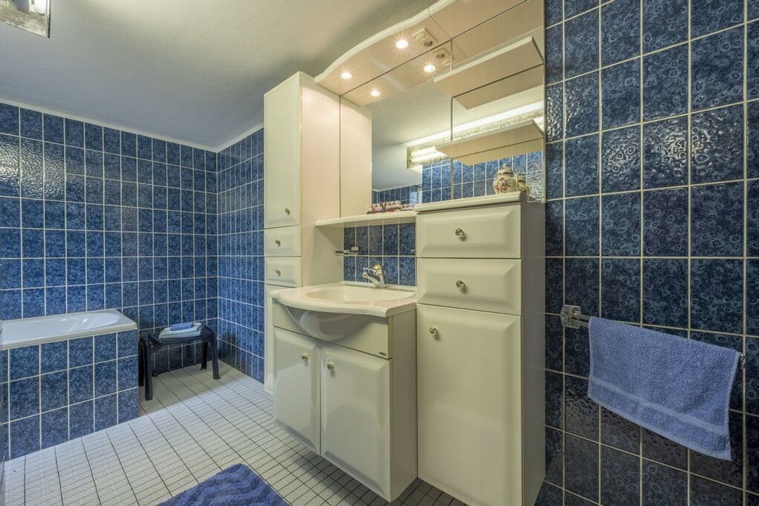 Vanuit het woongedeelte is via de trap, en eventueel traplift, is er toegang naar de begane grond. Hier is de nette toiletruimte met fonteintje en badkamer. De badkamer is voorzien van een ligbad met toilet en een wastafelmeubel.