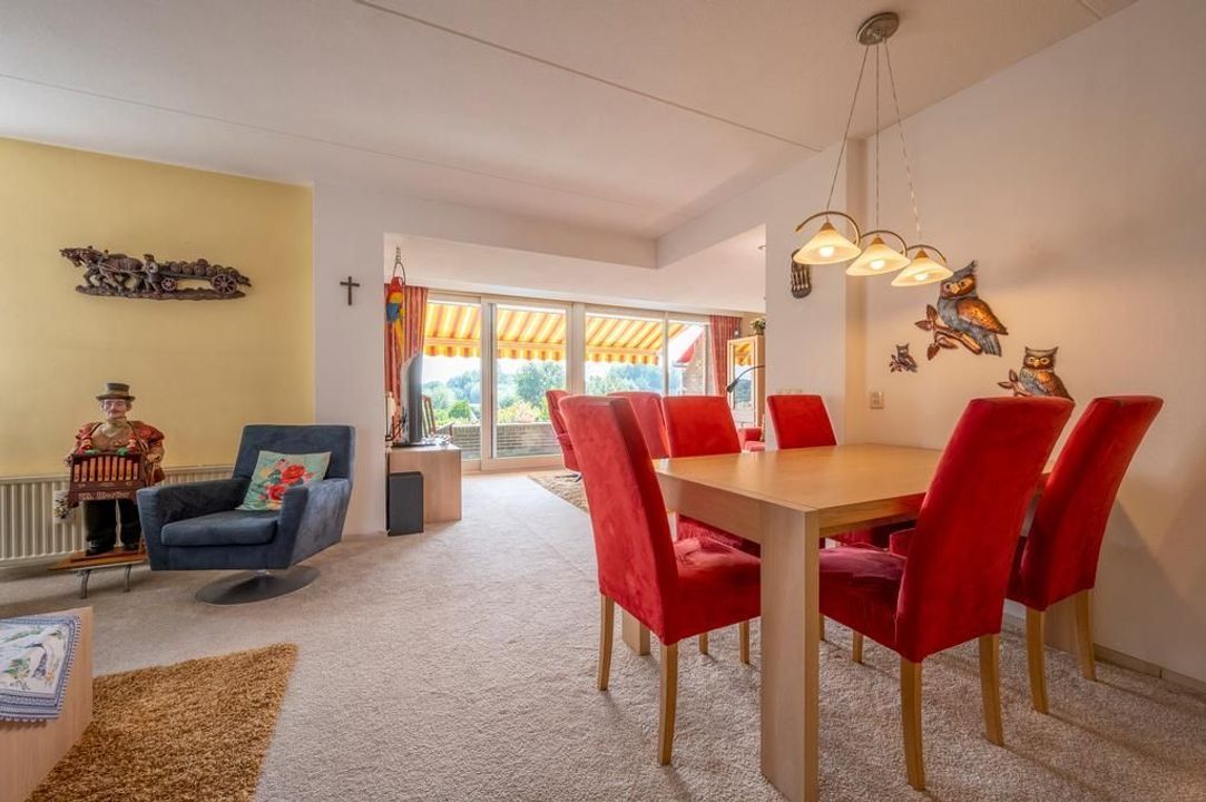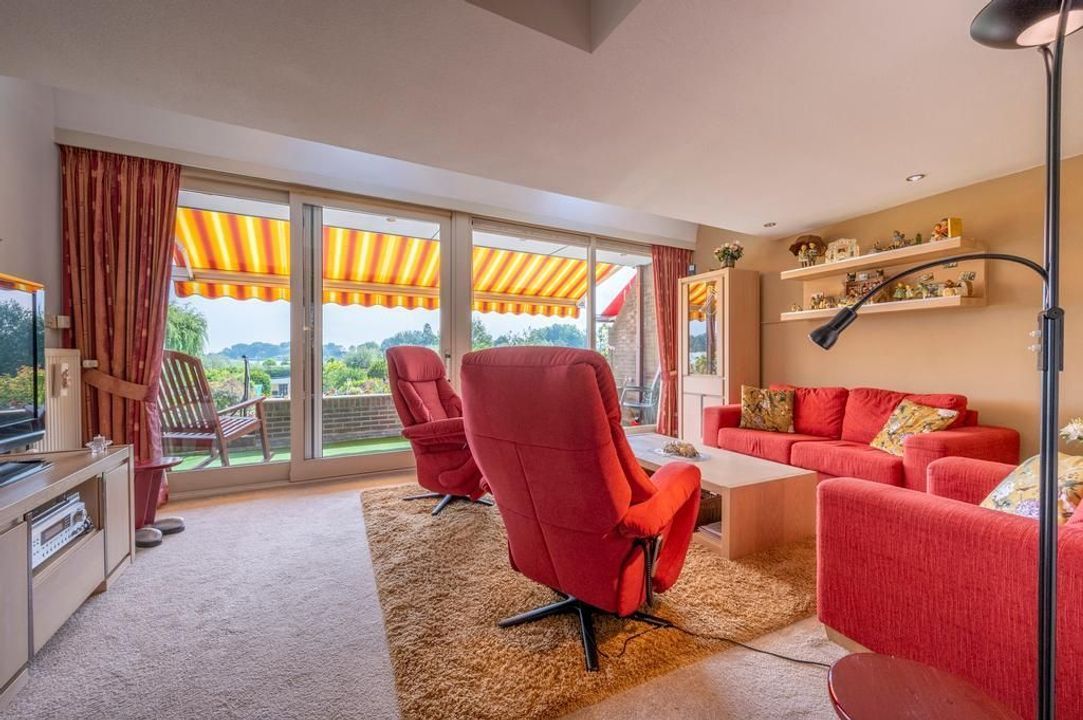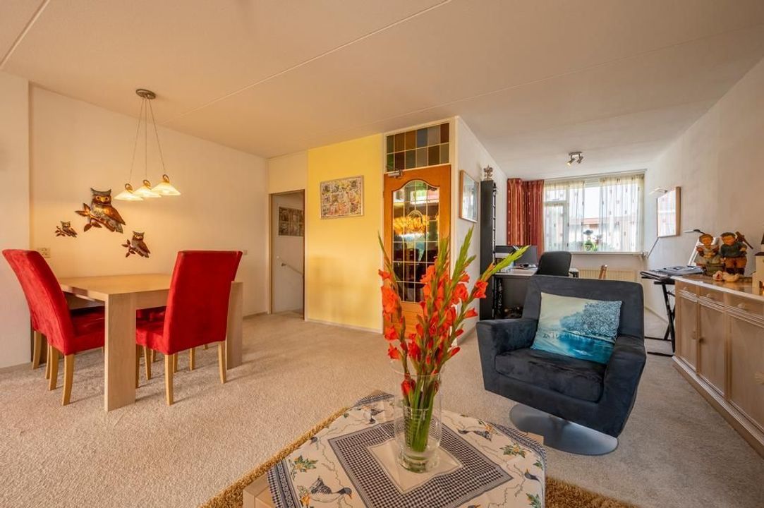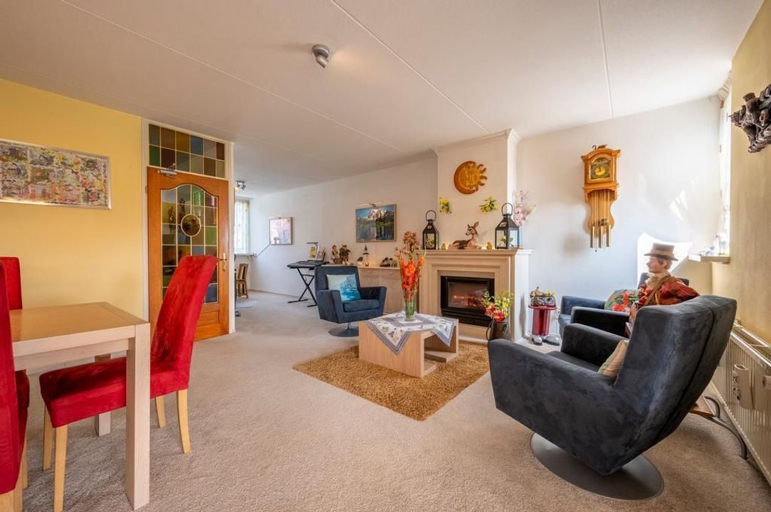 De woonkamer is voorzien van vloerbedekking, hieronder ligt een beige plavuizen vloer.
