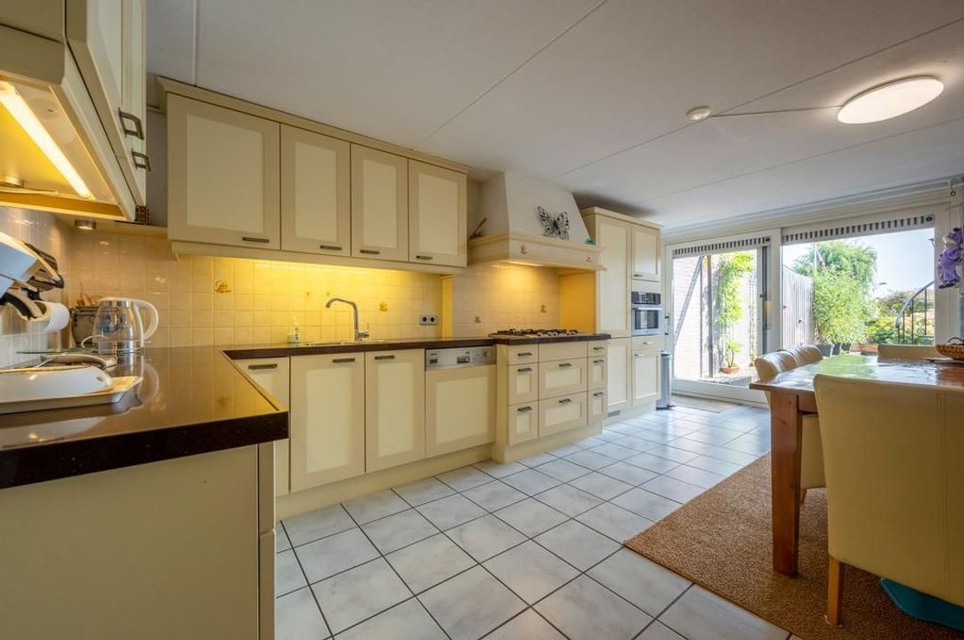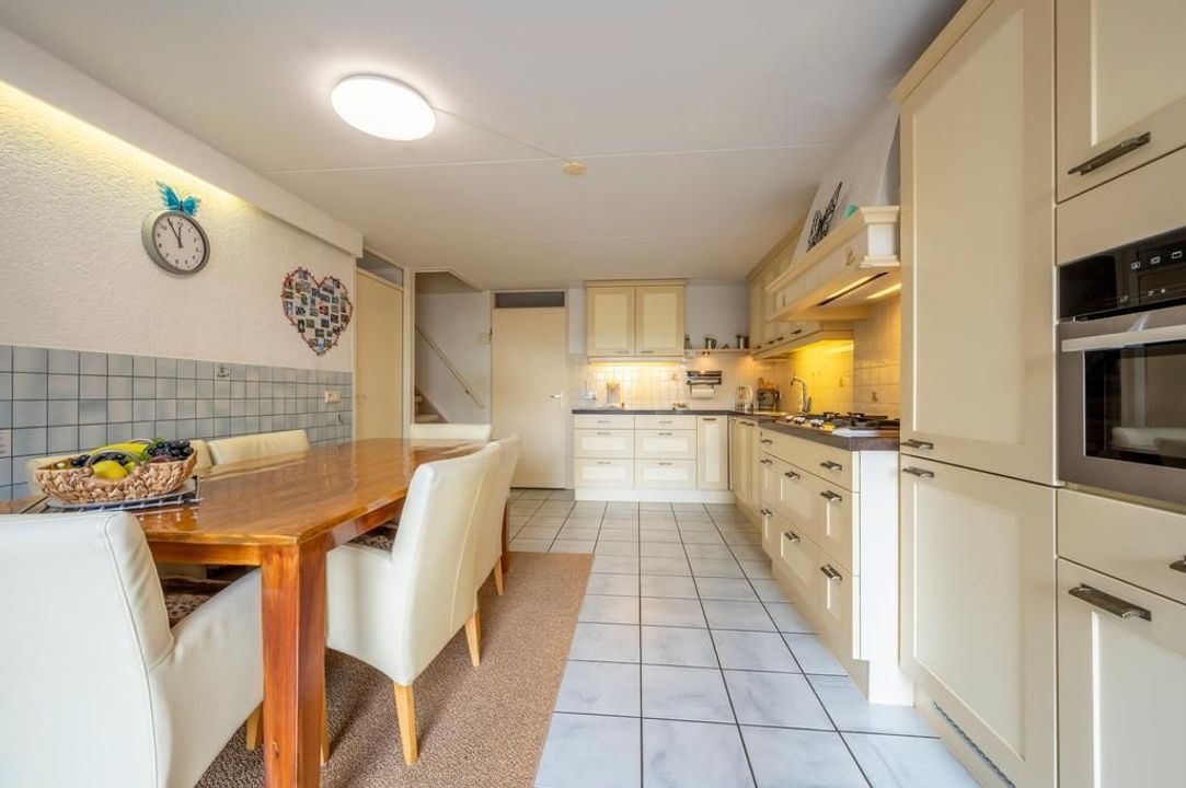 De woonkeuken is een heerlijke plek waar de hele familie bijeen kan komen. Er is meer dan voldoende ruimte voor een grote eettafel. De keuken is voorzien van een 5-pits gasfornuis met afzuigkap, vaatwasser, close-in boiler, combimagnetron, koelkast en vriezer. Het geheel is afgewerkt met beige keukenkastjes en een donkerbruin composiet werkblad. Via de schuifpui met hor is de tuin bereikbaar.