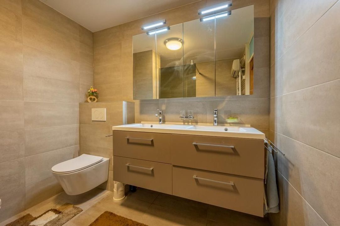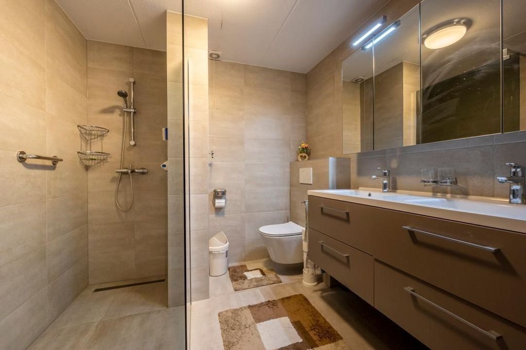 De luxe badkamer is in 2019 gemoderniseerd naar de nieuwste maatstaven: een grote inloopdouche, toilet, dubbele wastafelmeubel met grote spiegel en een designradiator. Het geheel is afgewerkt met beige wand- en vloertegels.