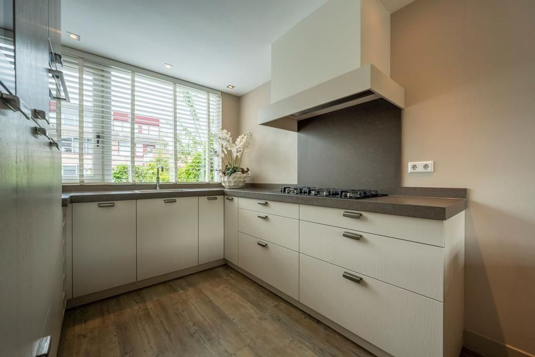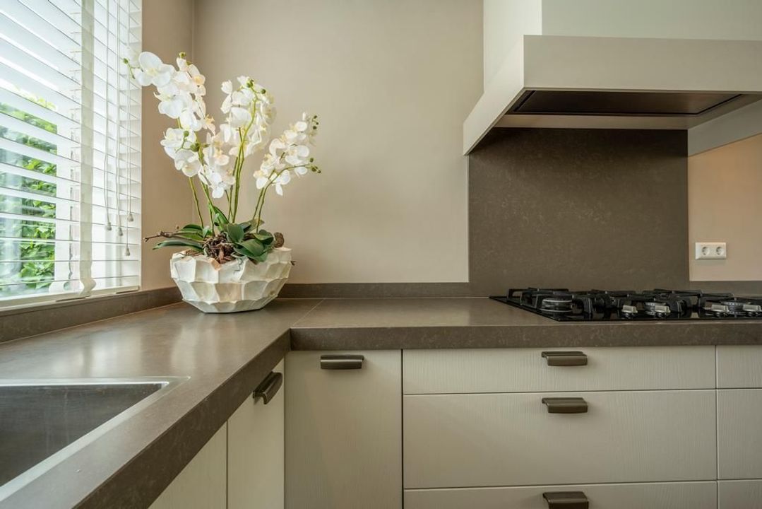 De keuken is afgewerkt met champagne keukenkasten- en lades gecombineerd met een taupe werkblad en sfeervolle lichtspotjes.
