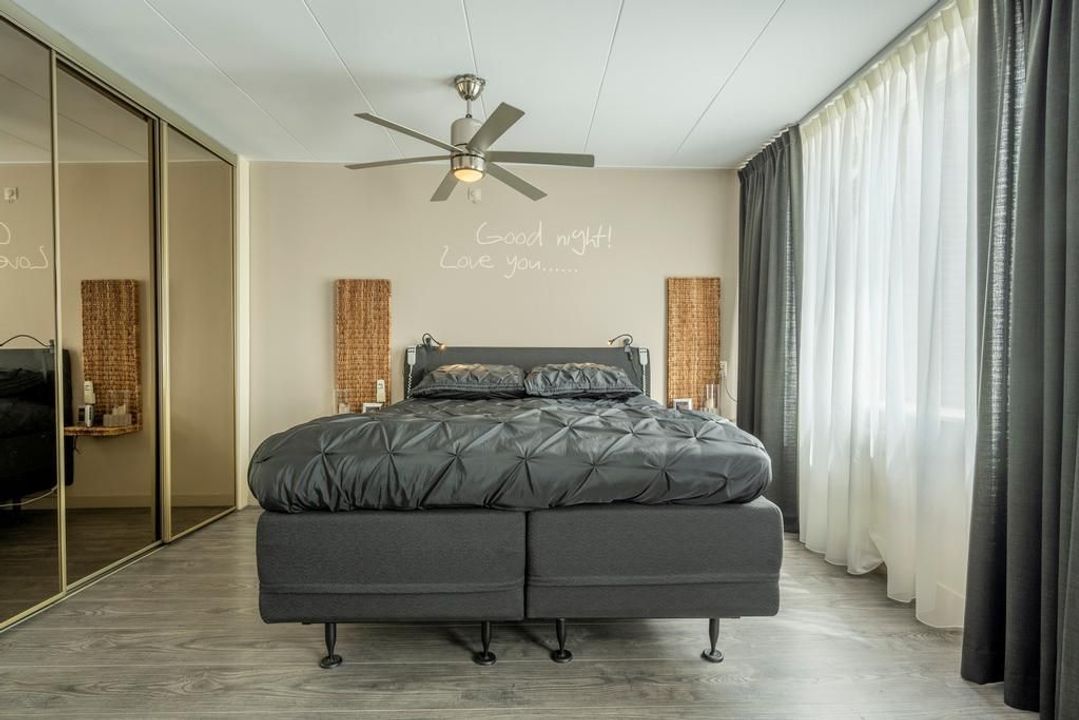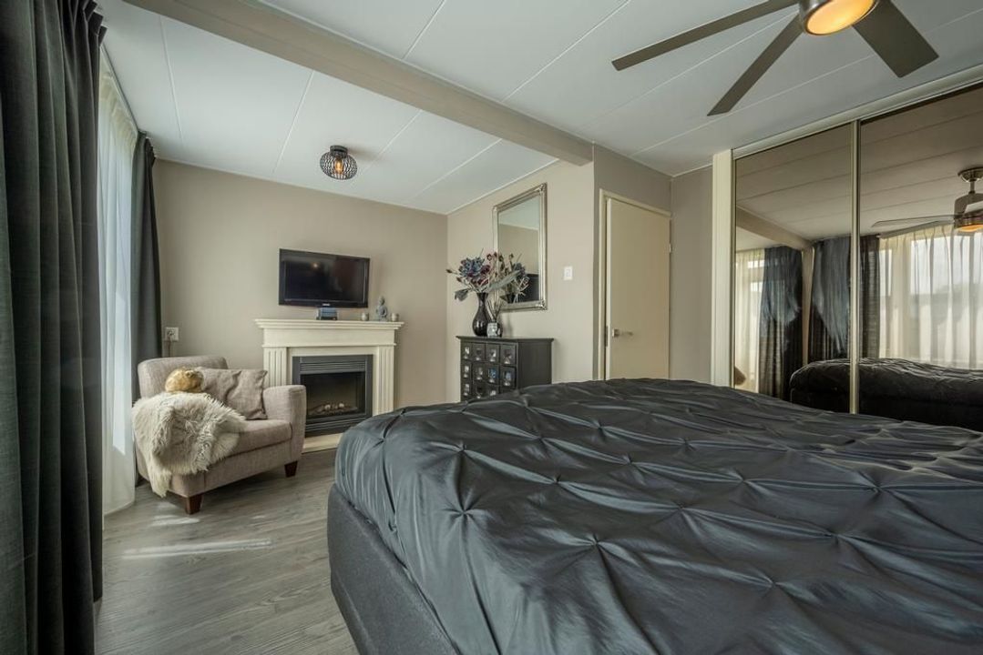 De ouderslaapkamer is aan de achterzijde gelegen met elektrische rolluiken en toegang naar het balkon. Verder is deze kamer voorzien van een vaste kledingkast met zowel hang- als leggedeelte en een gezellige elektrische haard wederom van het merk Faber. Voorheen waren dit 2 slaapkamers, dit is eenvoudig weer te herstellen.