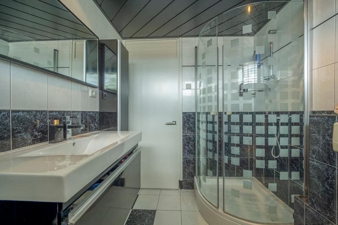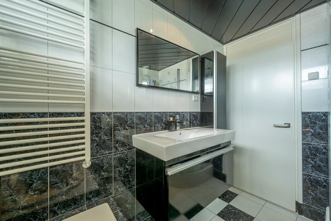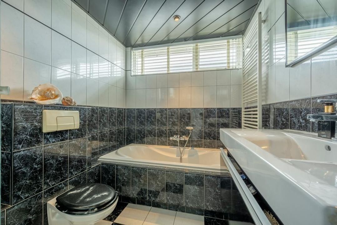 De nette badkamer is afgewerkt met zwart/witte vloer- en wandtegels gecombineerd met lichtspotjes. Daarnaast is de badkamer ingericht met een ligbad, douchecabine, toilet en een wastafelmeubel.