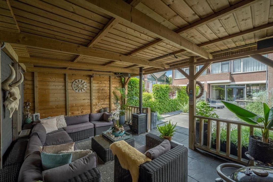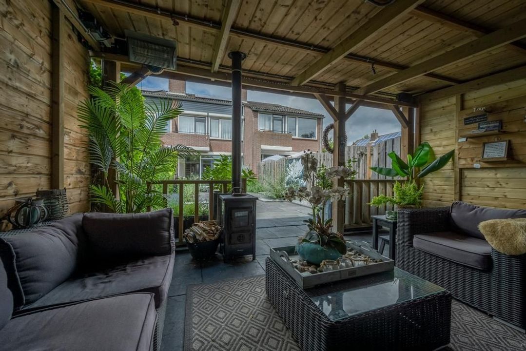 met dezelfde zorg ontworpen, aangelegd en verzorgd. Achter in de tuin is een houten veranda geplaatst voorzien van elektriciteit, heater en een sfeervolle haard, hierdoor kunt u al in vroege voorjaar en late najaar al heerlijk buiten zitten. Ook de voortuin is van dezelfde stijl als de achtertuin, helemaal compleet met een gelhaard en zitje (eventueel ter overname), containeroverkapping en toegang naar de berging. In de berging is ruimte voor fietsen en ook de wasmachine- en droger staan hier.